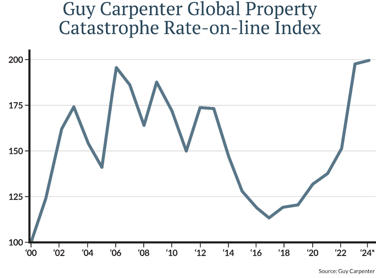 As profit-motivated entities, insurers/reinsurers are incentivized to offer policies only in areas and at rates they believe will generate profits over the long term. The industry experienced several challenging years between 2017 and 2022 due to an overabundance of capital that drove down premiums and large-scale insurable events. The industry has adjusted by demanding record-high premiums for coverage (shown below), withdrawing from areas considered too high risk, and updating forecasting models to reflect climate trends. The results of these efforts, combined with minimal insurable catastrophic events, produced index returns of 19.7% during 2023 and position the asset class for attractive potential returns in 2024.