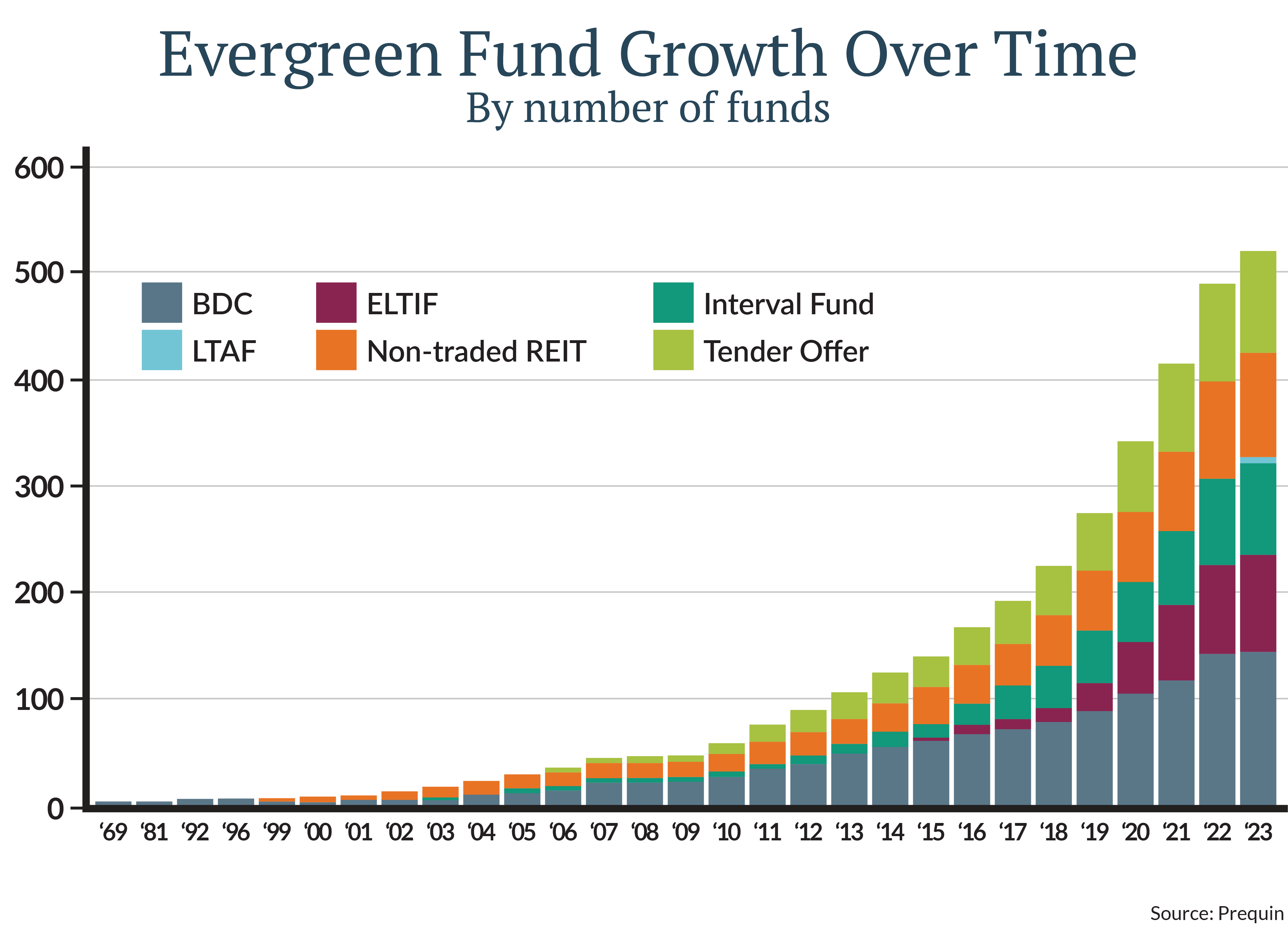 Some of these are so-called evergreen funds, named for their contrast with traditional limited-term structures such as private equity funds.The following chart shows the increase in several types of evergreen funds that are getting significant attention from investors and their advisors in recent years. These fund structures allow investors to allocate to the strategies daily or monthly, and commonly provide exit opportunities on a quarterly basis.
