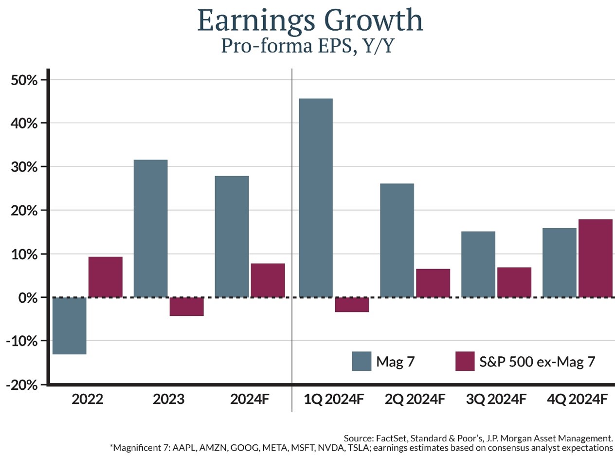 Here’s what’s going on. In 2023, the so-called Magnificent Seven stocks (Apple, Amazon, Google, Meta, Microsoft, NVIDIA and Tesla) dominated returns for the S&P 500 Index. That’s because of strong earnings and sheer size; they now make up about 29.7% of the Index’s weight of the S&P 500 Index. The rest of the Index, by contrast, experienced more normal or average returns last year.