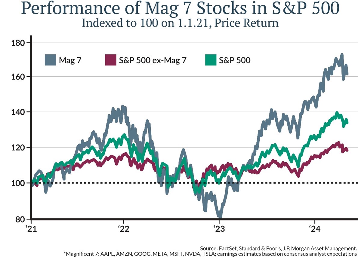 If those estimated changes to earnings hold, then we may see some correction to the historically extreme performance disparity shown in the chart below. The gray line—showing the Magnificent Seven stocks’ performance—has far outpaced the rest of the market (red line).
