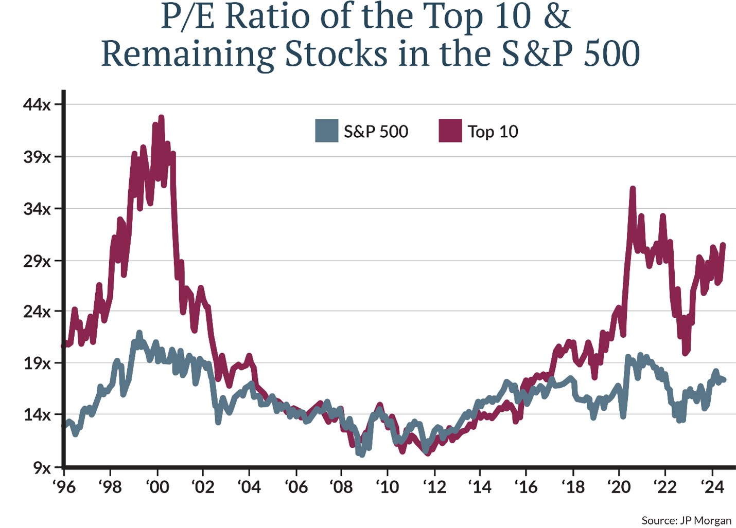 At the moment, the top 10 stocks in the S&P 500 Index skew towards growth. The chart below shows the average price/return ratios, a proxy for valuations, for these top 10 stocks is elevated, at around 149% of the long-term average for those companies. By contrast, the price/return ratios for the remaining 490 stocks in the index are closer to their long-term averages.