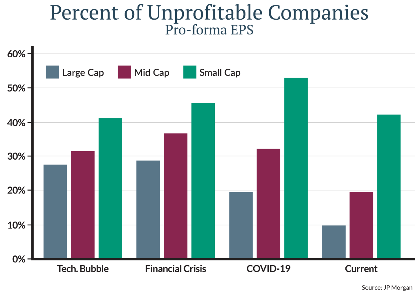 Within the small position in small cap stocks, we believe active management within the space can pay off. The chart below shows that about 42% of small-cap stocks are unprofitable. In less efficient spaces of the stock market, we prefer active management over passive indexing. (The same rings true in fixed income, where over 70% of active managers outperformed the core bond index over the past five years.)