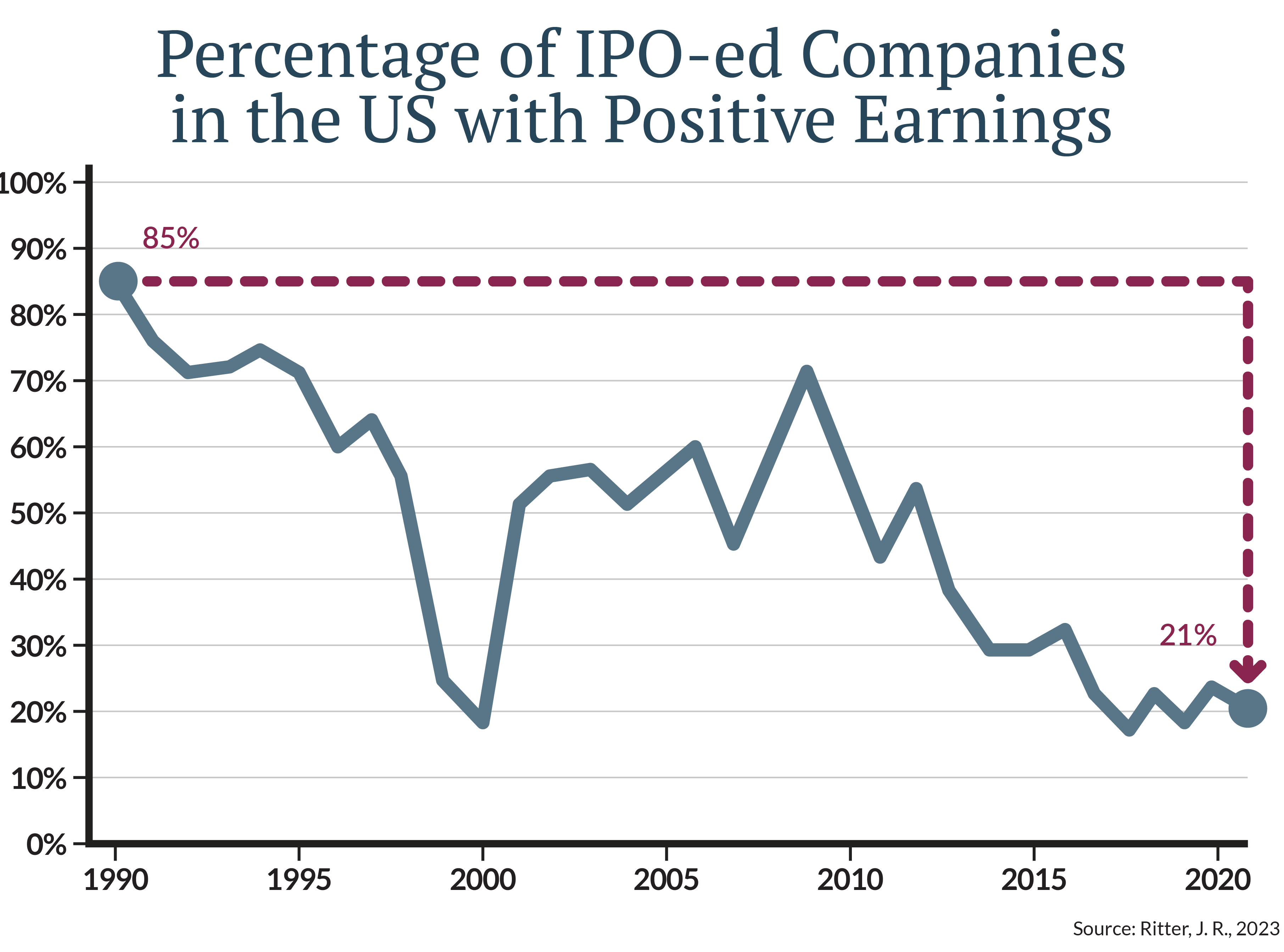 - Declining quality: Going public once represented a graduation to the "next level," a sign that a business had come of age. That is no longer the case, as today's IPOs are frequently unproven businesses raising money to fund big ideas with uncertain outcomes. This is highlighted by the persistent decline in the percentage of IPOs with positive earnings, as shown. [Figure 3]