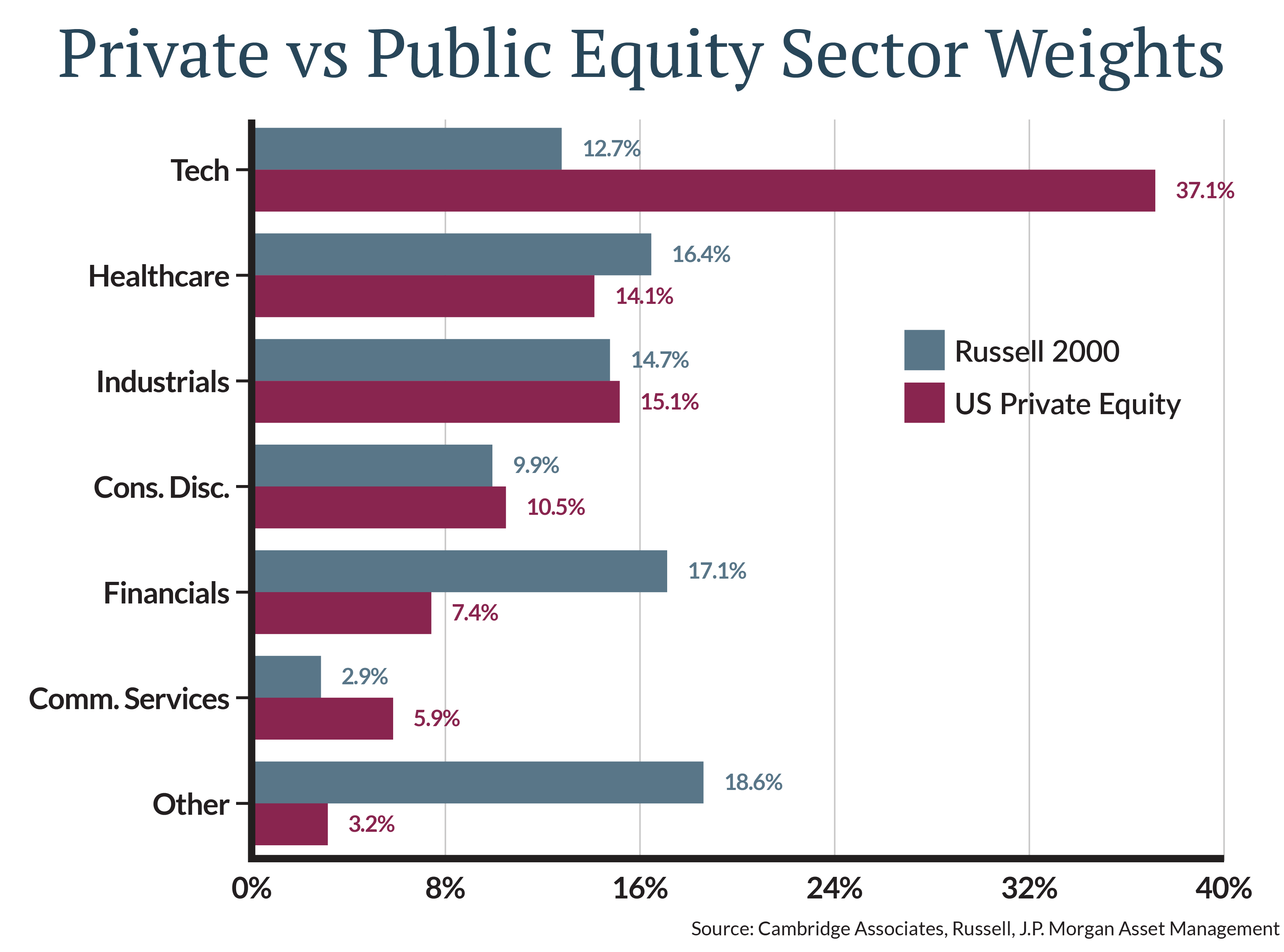 - ‘New economy’ businesses: As more businesses choose to remain private, a gap has emerged between the sector allocations of private equity-backed companies and the public markets, as shown below. [Figure 4] A significantly larger portion of private equity-owned companies are in the technology sector, an area of our economy with rapidly growing influence.