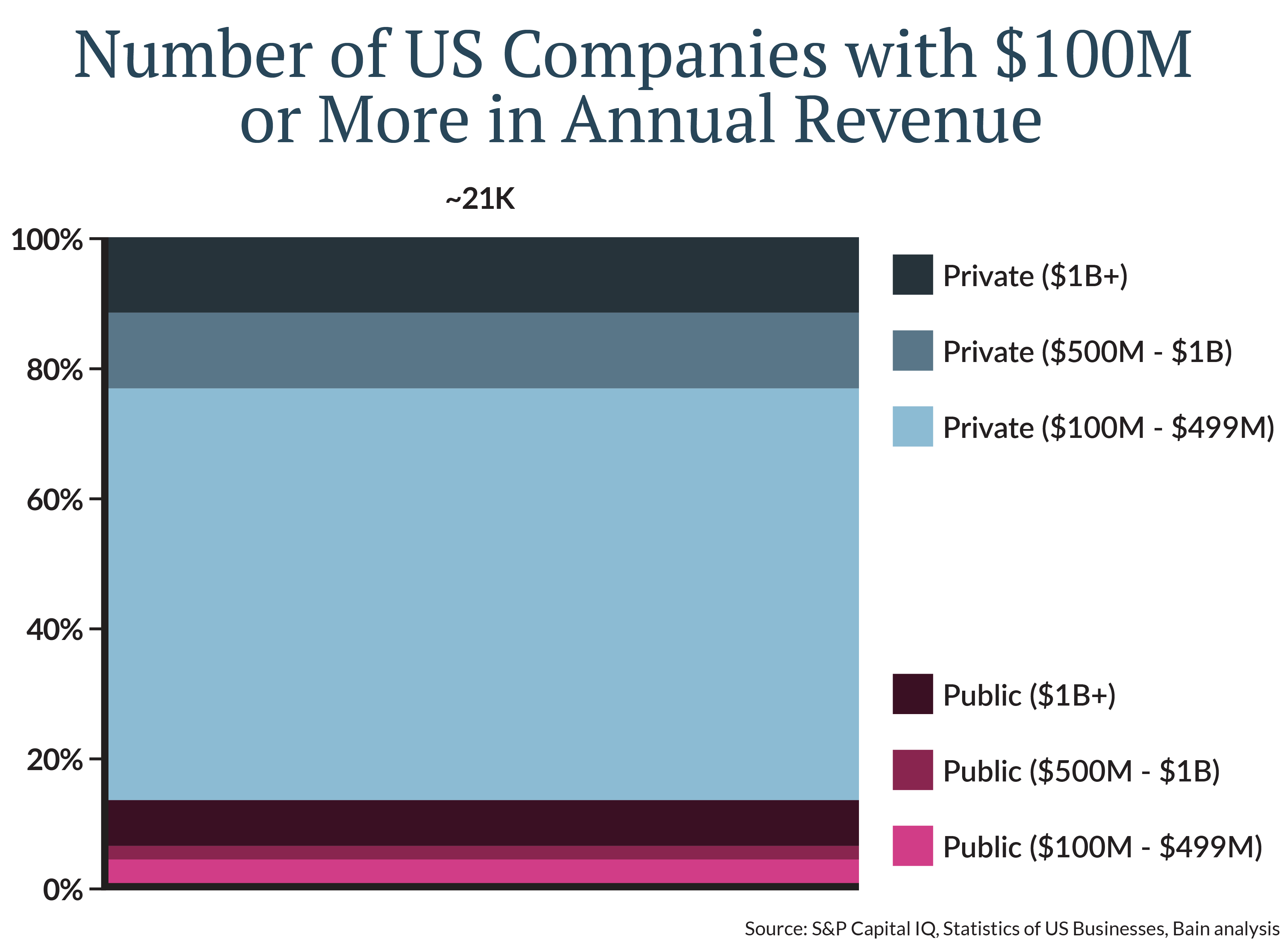 - Narrower opportunity set: Investors limited to investment in publicly traded businesses are exposed to a narrow and shrinking portion of the total economy. As reflected in the chart below [Figure 2], more than 80% of American companies with revenue greater than $100 million are privately owned.
