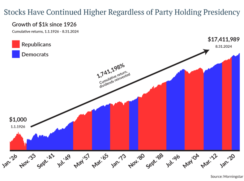 Within client portfolios, we have made small adjustments towards quality focused companies and non-cyclical sectors. Looking ahead, we see opportunity in small and mid-cap equities due to lower interest rates. The election outcome does not change our long-term capital market assumptions and as a result, we do not make drastic shifts based upon the results. Staying the course is the most important factor behind financial-plan success. Regardless of who is in office, stocks historically have continued higher.