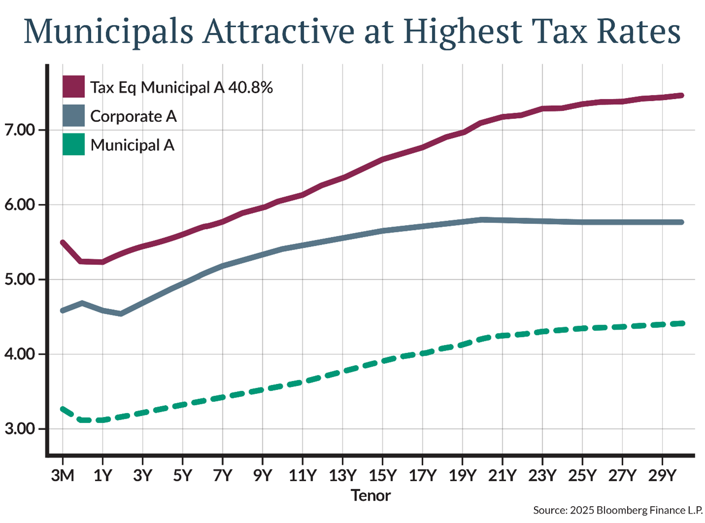 We believe tax-exempt municipal bonds offer compelling value, with taxable equivalent yields approaching 6-7% for investors subject to the highest tax brackets [Figure 3]. Here it should be noted that as rates rise, so too does the value of tax exemption. A 3% tax-exempt yield is equivalent to about 5% taxable for an investor subject to the highest 40.8% tax, a gain of two percentage points over the nominal yield. At a 4% nominal yield, the taxable equivalent yield is about 6.67%, a gain of 2.67 percentage points over the nominal yield.