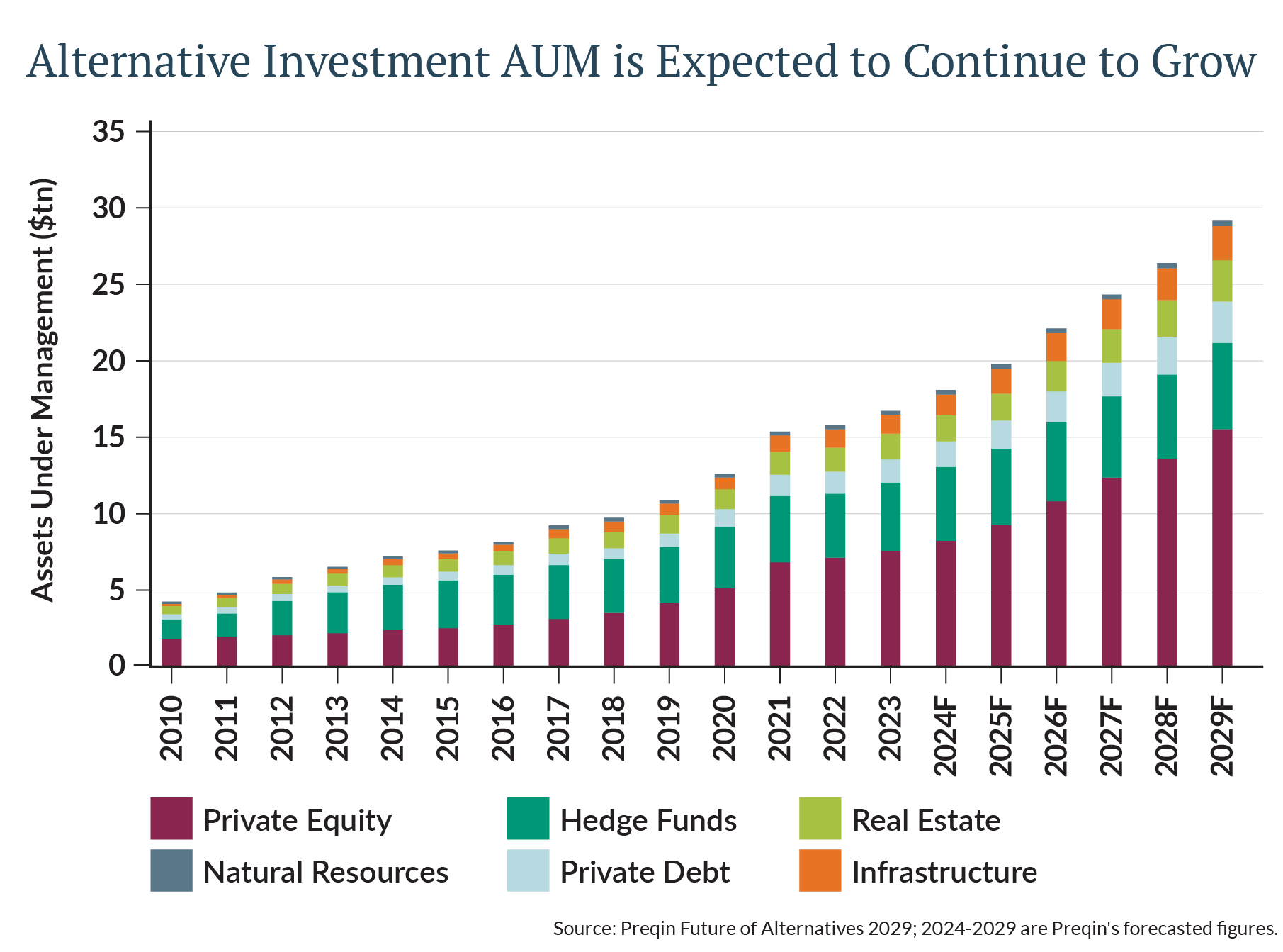 Growth in alternative asset categories continues to climb. According to a study by Preqin, alternative assets registered $18.2 trillion at the end of 2024 and are forecasted to exceed $29 trillion by the end of 2029.
