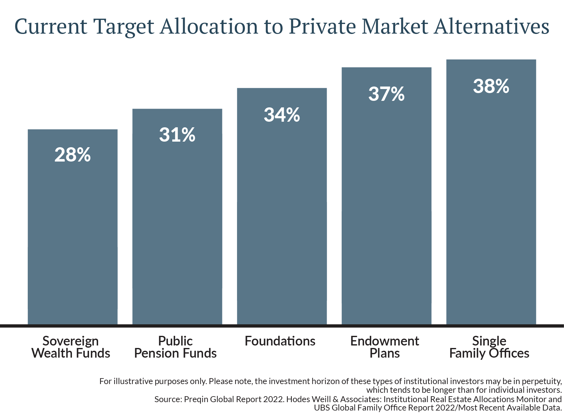Alternative assets have long been utilized by institutional investors (pension plans, endowments, foundations and others). For this type of investor, exposure to alternatives represents a meaningful portion of their total investments. As reflected in the chart below, this figure ranges from about 30-40% of their overall allocation. Behind these large allocations are a number of factors. These include: