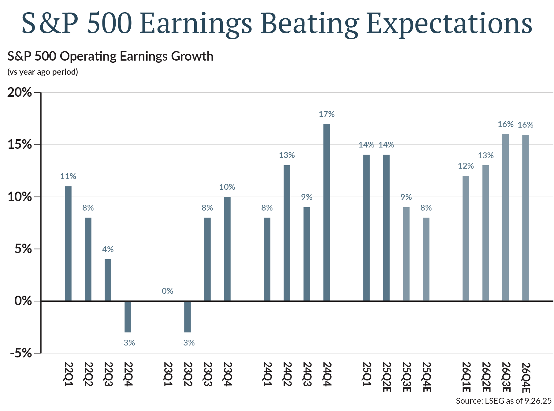 In short, earnings and AI. Profits drive the long-term performance of stocks, and profits continue to rise. S&P 500 earnings grew 13.8% in the second quarter of 2025 vs. the 5.8% increase analysts expected at the start of the quarter. Estimates for the third and fourth quarters have been revised higher, and double-digit earnings growth is projected in 2026 [Figure 1].