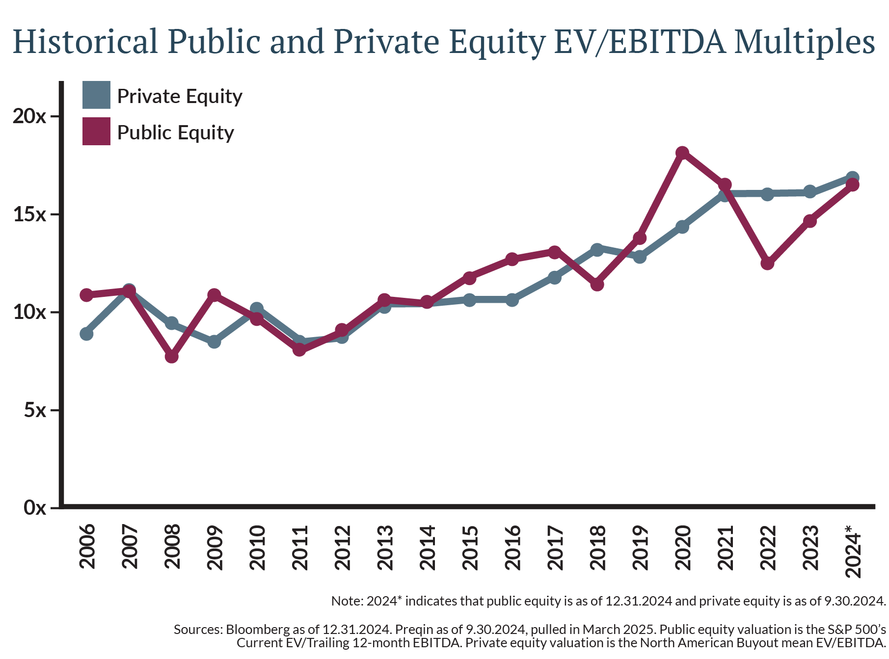 Multiples (that is, the value of the company as a multiple of EBITDA) vary over time as the economy and investor preferences change. While there are periods of divergence between the private and public equity ratios—often driven by broader public market dislocations—they have proven to be temporary.