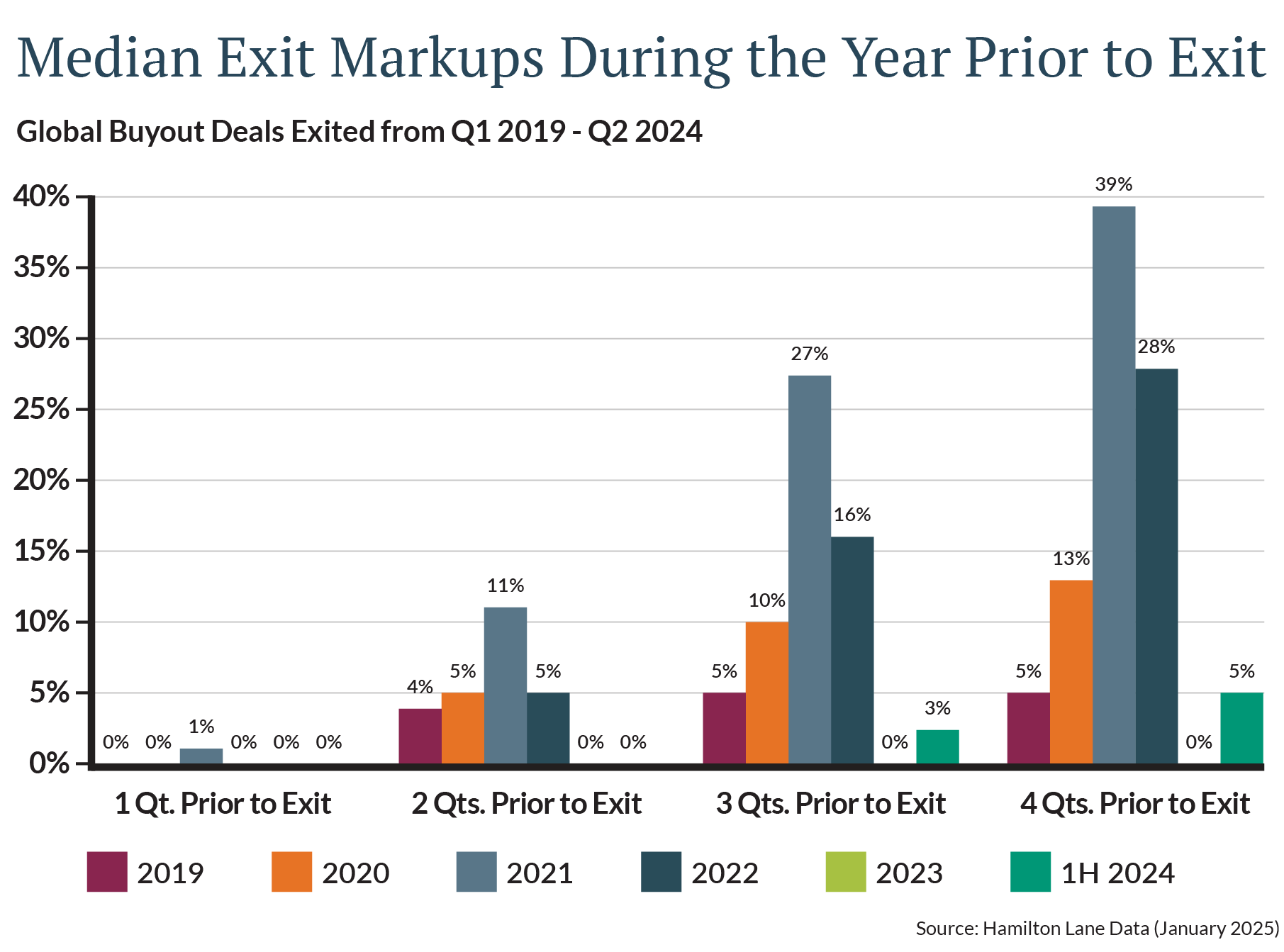 The following chart, from longtime private market consultant Hamilton Lane, shows several years' worth of data on "exit markups"—that is, valuations in the time leading up to the business sale and the determination of value to a buyer. Note, in particular, the right-side portion of the chart, which indicates that private assets have generally sold at higher prices than they were valued at four quarters (one year) before exit. This suggests that, if anything, private asset managers may have conservatively valued the assets in question.