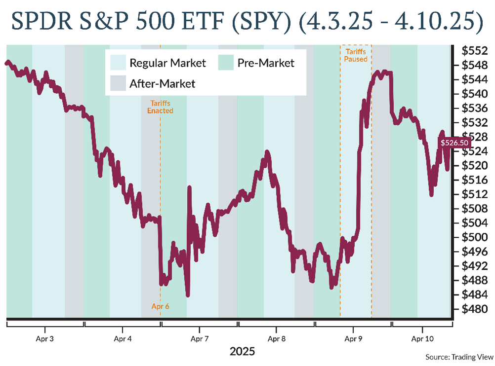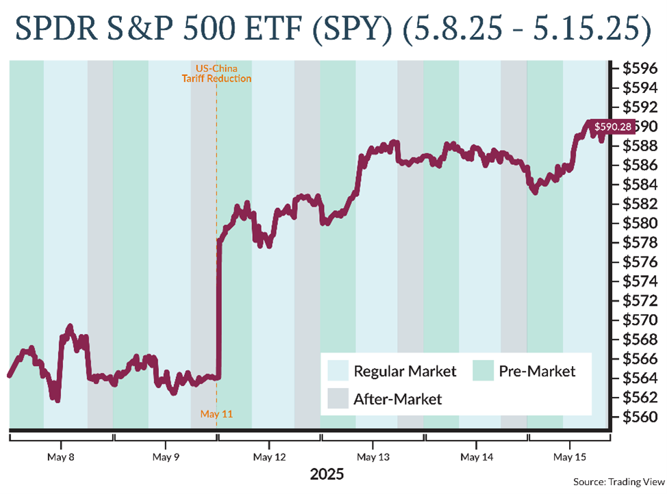 To demonstrate how quickly new information is priced into the stock market and the folly of timing it, we have segmented two periods during the recent tariff volatility. The first shows the market movement of the SPDR S&P 500 ETF (SPY) around the time that reciprocal tariffs were announced on April 2 and the pause was enacted a week later on April 9. The second shows the SPY during the week of de-escalation of trade tensions with China on May 11.