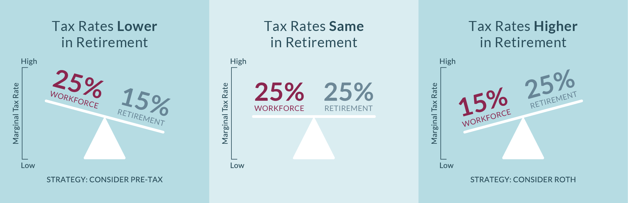 On the other hand, Roth after-tax contributions make the most sense for someone who believes their current income tax rate is lower than it'll be during retirement. By contributing after-tax, you will have no tax liability on your retirement assets when you start to withdrawal.