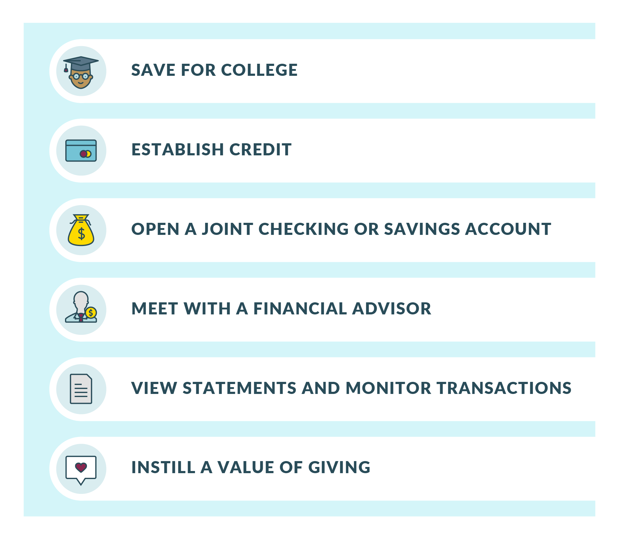 Upon eligibility, consider opening a joint checking account or savings account with your teenager. As a parent, it’s up to you to determine the most appropriate timing for this milestone. For example, maybe it’s when your teen gets his or her driver’s license or first part-time job.