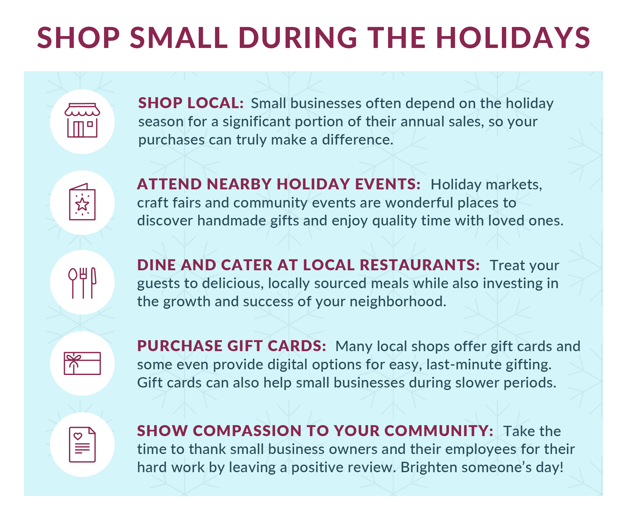 The holiday season is a magical time of year, filled with joy, celebration and the spirit of giving. As you check off items on your shopping list and plan holiday events, consider the impact you can make by supporting your community. Here are five impactful ways to show your support for local small businesses during the holidays: