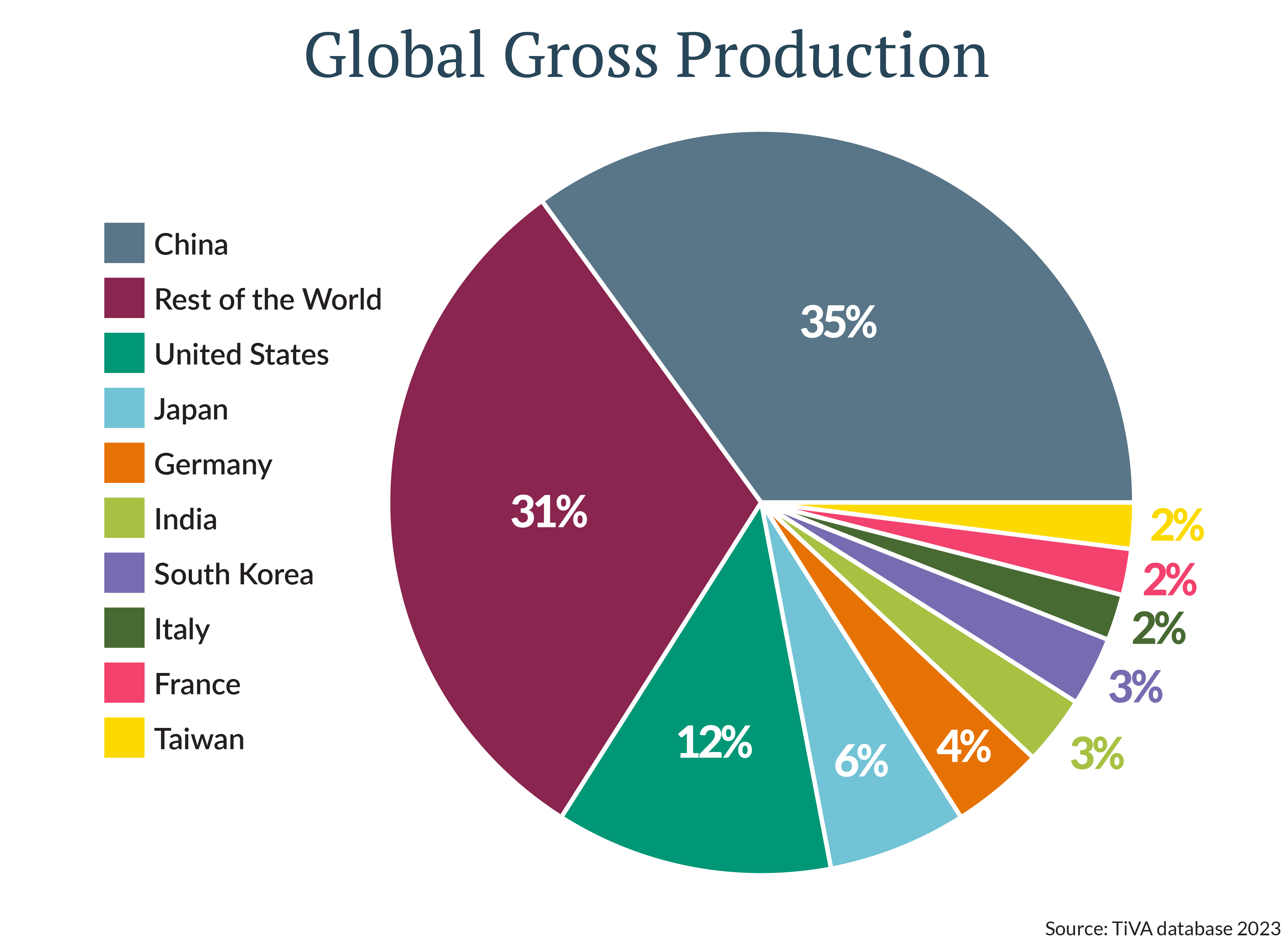 - China is the largest manufacturer in the world, responsible for approximately 35% of global production.
